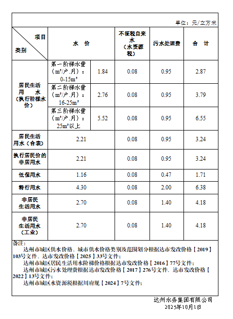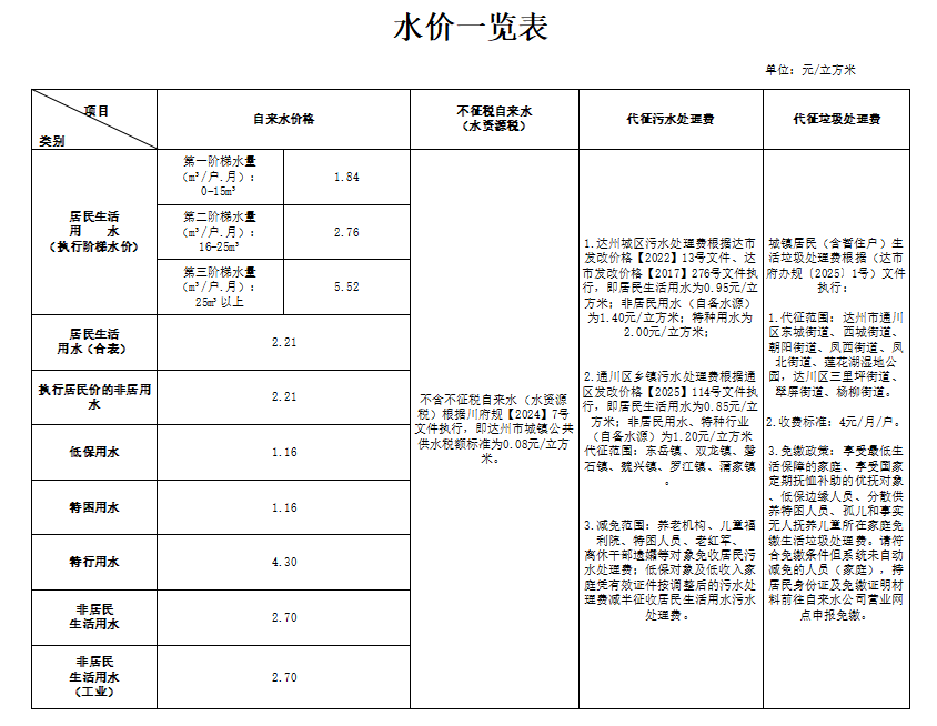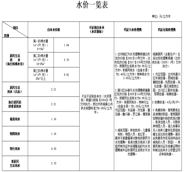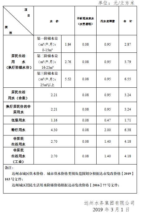 達(dá)州市城鎮(zhèn)供水銷售價(jià)格一覽表